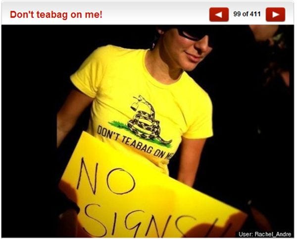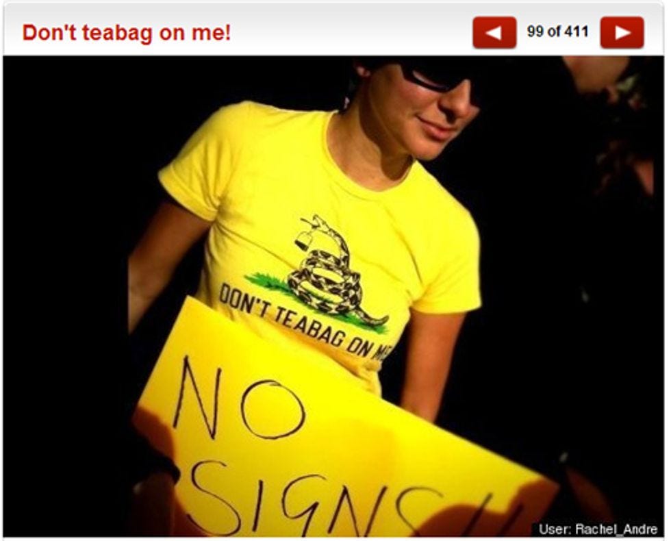 Hooray for this person, in her stylish "Don't Teabag On Me" tea-shirt. For some reason this is on theHuffington Post. Also, which Wonkette readers didthis elaborate routine? [ HuffPo ]
