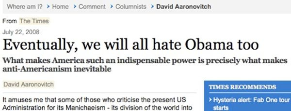 Everybody loves Barack Obama, especially the British, who prefer the handsome young celebrity 5-to-1 over cranky old World War I veteran John McCain. But what will happen once Obama becomes president? One Englishman at the Times of London knows the answer: The world will turn on Handsome Barry, because he is an American, and everything bad in the world must eventually be blamed on America, even the post-Bush/Cheney America. [ Times of London ]