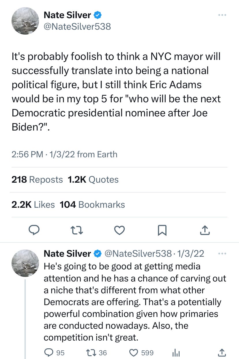 Yet, he was the great Black centrist hope. Nate Silver and his shattered crystal ball declared in January 2022, “It’s probably foolish to think a NYC mayor will successfully translate into being a national political figure, but I still think Eric Adams would be in my top 5 for ‘who will be the Democratic presidential nominee after Joe Biden?’”