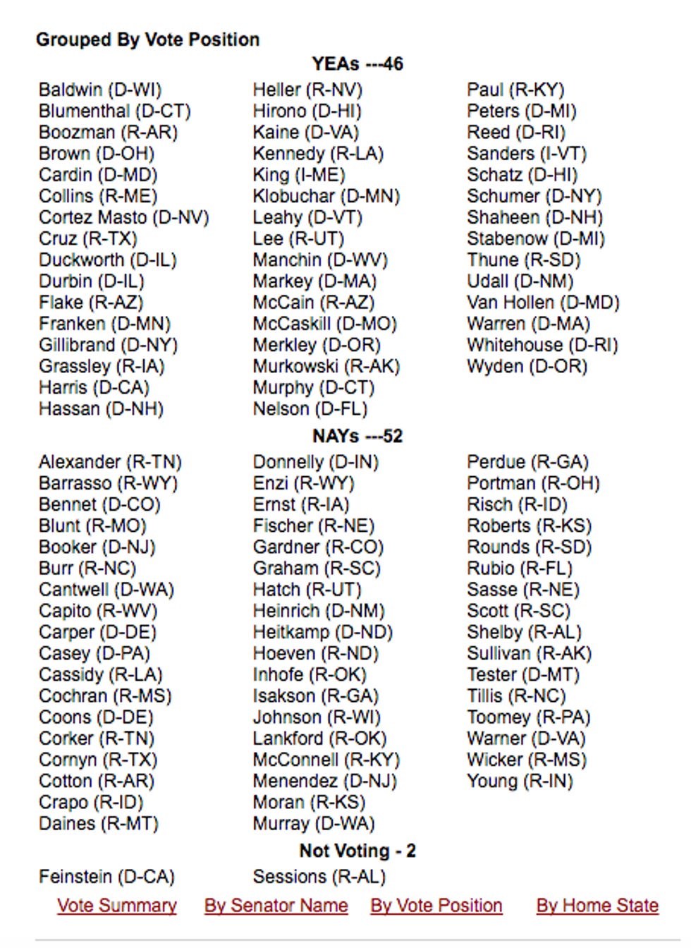 The other Democratic senators who voted against the bill were Michael Bennet (D-CO), Thomas R. Carper (D-DE), Bob Casey Jr. (D-PA), Chris Coons (D-DE), Joe Donnelly (D-IN), Martin Heinrich (D-NM), Heidi Heitkamp (D-ND), Bob Menendez (D-NJ), Jon Tester (D-MT), Mark Warner (D-VA), and to my very big surprise and disappointment, Maria Cantwell (D-WA) and Patty Murray (D-WA). Seriously what the hell ladies, you are usually so good!