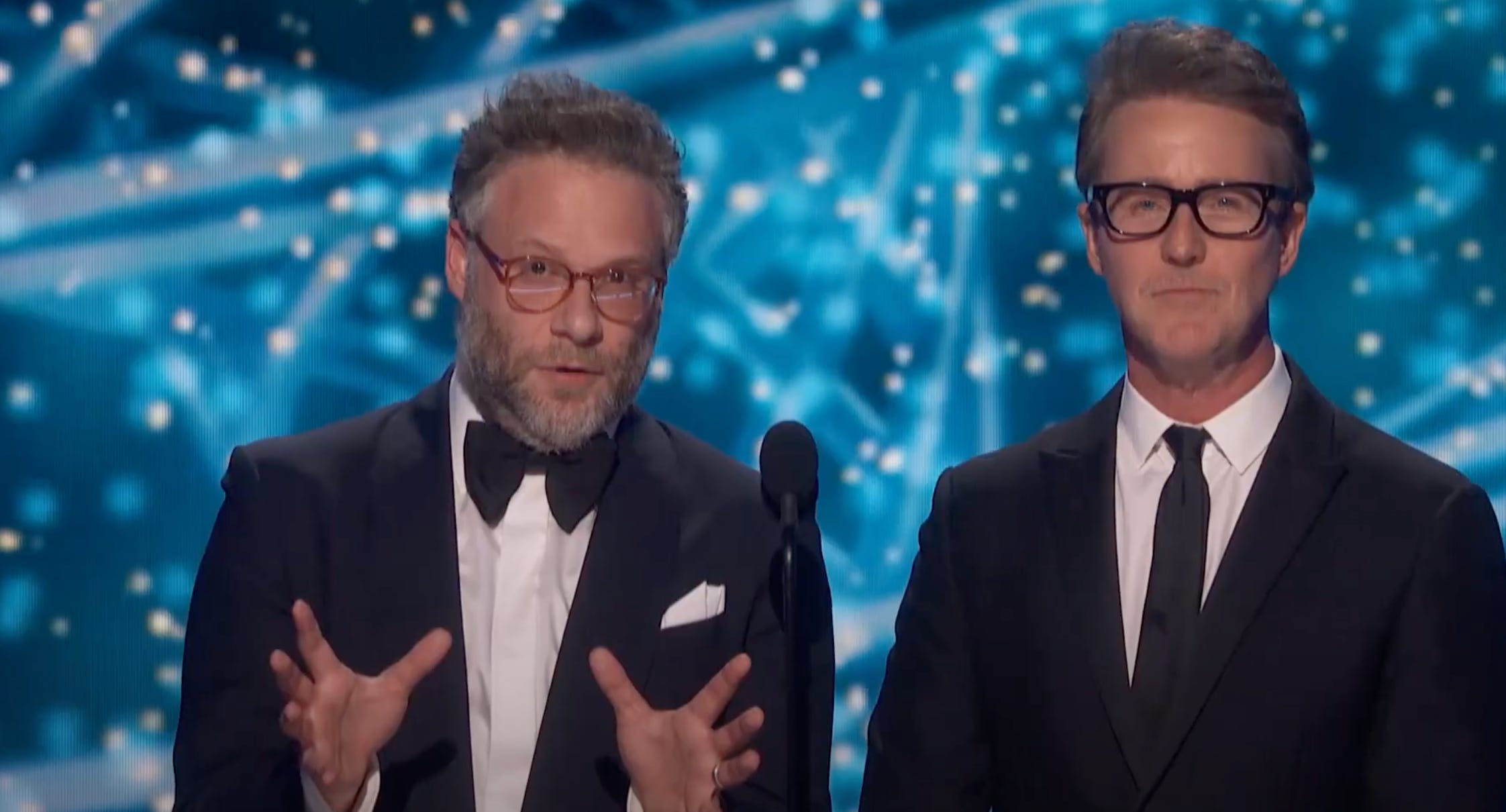 And Rogen was a presenter, along with Edward Norton, but before they gave out an award to Dutch theoretical physicist Gerard ’t Hooft, Rogen looked out at the crowd and said: