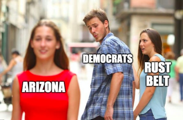Go West, young man! Don't spend all your time and energy in the Rust Belt, because we have just as good a shot at taking Arizona's 11 electoral votes as we do Wisconsin's 10. And we have a better than even chance of picking up a Senate seat in the Grand Canyon state if we can somehow induce our voters to show up like they did in 2018, when they rejected Martha McSally the first time. Which is why the senator just hit the panic button and begged for a bailout from out-of-state donors.