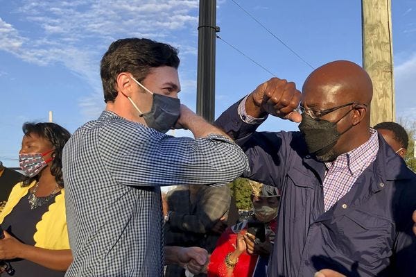 Ossoff ran a disciplined, smart campaign. This contrasted sharply with Perdue, who could only offer Georgians his personal devotion to Donald Trump. Perdue's campaign wasn't as overtly racist as Loeffler's, which would've required making appearances in a Klan hood, but he did run a grotesque ad that artificially (and obviously) enlarged Ossoff's nose. Ossoff is Jewish, and the big nose ad also linked him to Senate (Soon-to-be-Majority) Leader Chuck Schumer, who was accused of trying to “buy" Georgia.