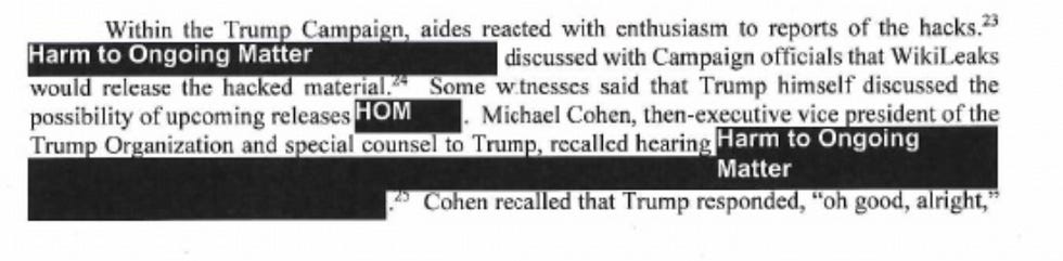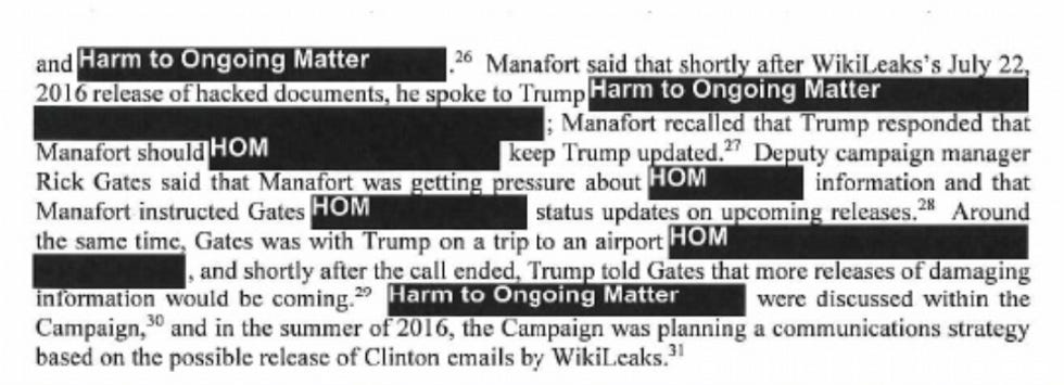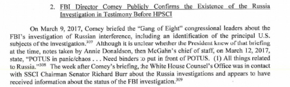 A footnote from page 52 says Burr briefed the White House counsel's office after his secret Gang of Eight briefing on "4-5 targets" of the investigation, including Flynn, Manafort, Carter Page, HARM TO ONGOING MATTER, and "Greek guy," which, LOL, seems to be George Papadopoulos, we guess.