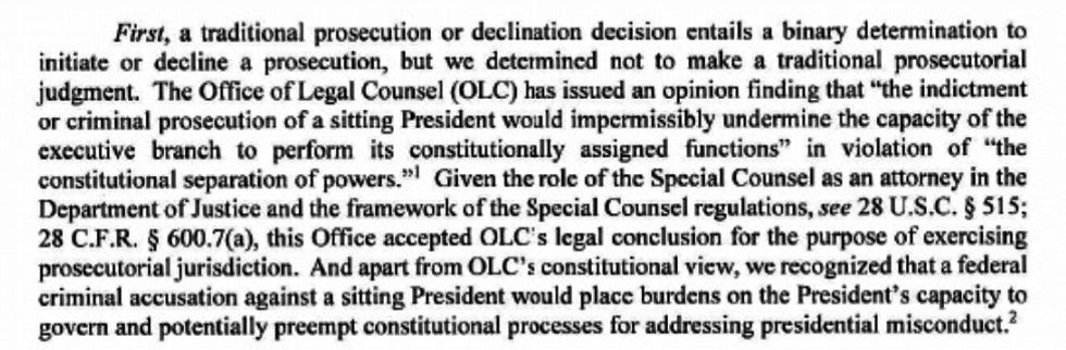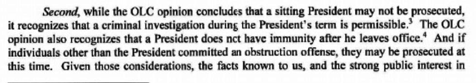 In this second section, Mueller is JUST SAYING that you sure as fuck can prosecute a president the very second he leaves office. Oh, and it's cool to investigate them criminally while they're in office. He is just saying.