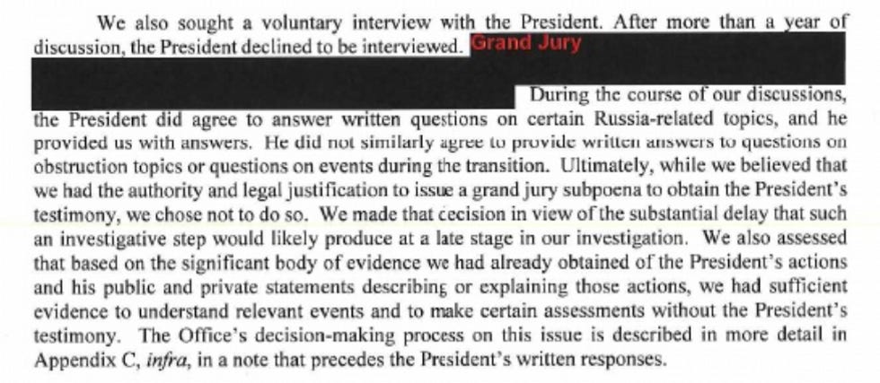 3: 16:Pages 8-11 summarize a lot of legal terms and analysis and case law, if you are into reading that sort of stuff. We're skipping it. On page 13, Mueller addresses the fact that he tried to get, but ultimately did not receive, an interview with Donald Trump, who is willing to say SO MUCH SHIT, but refuses to do so under oath, because he's a fucking liar. There's a curious grand jury redaction there: