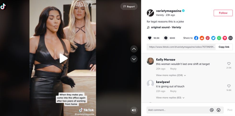On Variety 's official Tiktok, where the interview was posted, the magazine made a soundbite of Kardashian's line about people not wanting to work, with "When they make you come into the office again after two years of working from home" written over it and the caption "For legal reasons this is a joke."