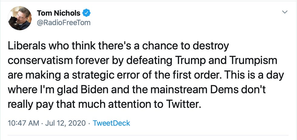 Never Trumper Tom Nichols cautioned on Twitter the other day that it was a “strategic error" for liberals to think there's a chance to rid ourselves of conservatism when we kick Donald Trump to the curb.
