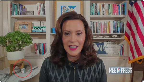 If you look very, very closely, you'll see an "8645" pin on the table behind Whitmer. This is apparently a secret, coded message from the governor to take out the president ... or the toughest part of the eye exam.