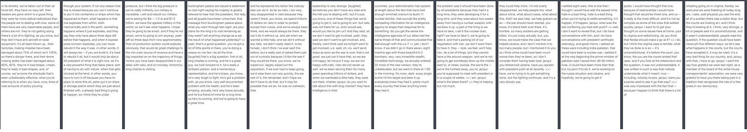 TRUMP: But it’s just, you know, one of these things that we’re going to get it, we’re going to win. But NATO was not there for us. And I would ask, would you like to join us? And they said, sir, we don’t want to get involved. Yeah, they said we don’t want to get involved. and, frankly, went think said we tonight want to get involved, UK said, oh, no, we’ll send ships as soon as the war is over. That’s not good. We just can’t have that. So we are not happy. Let me put it way, we are not happy with NATO. NATO did not serve us well. We’ve been serving them for many years spending trillions of dollars, and when we wanted a little help, they were not there. I settled eight wars. This is one that I thought I would have had easiest time.