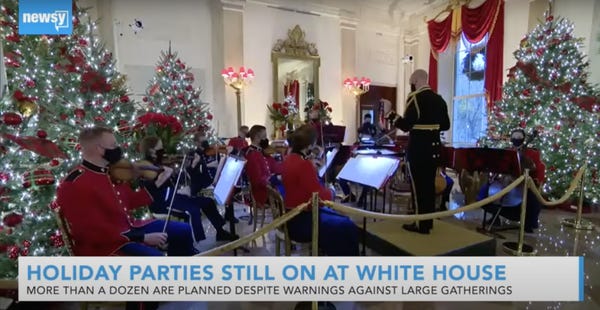 My poor, sad brother, Jerome Adams, the US surgeon general, stressed again on "Good Morning America" last week that holiday celebrations should be “small" — under 10 people — and outdoors, if possible. That's not what the Trumps are doing and he was asked if he'd at least tried to talk to them out of killing more Americans. Just take the month off. It's Christmas, for God's sake!