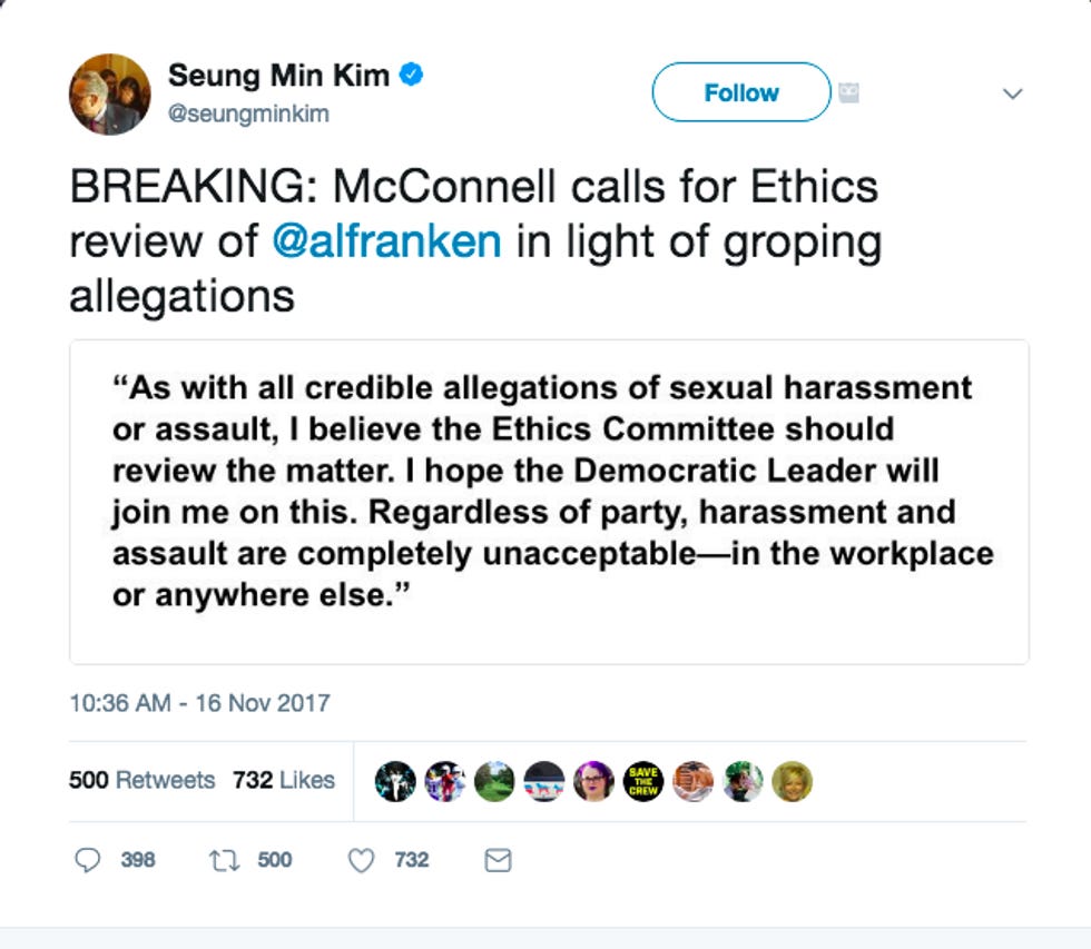 As a result of Franken acting like a creep, Mitch McConnell now gets the satisfaction of getting to call for an entirely warranted ethics investigation into his behavior.