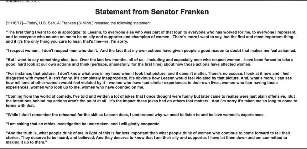Franken has since issued a statement. It is a good statement, as far as these things go.