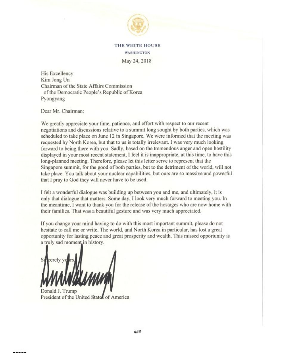 We were informed that the meeting was requested by North Korea, but that is totally irrelevant. I was very much looking forward to being there with you. Sadly, based on the tremendous anger and open hostility displayed in your most recent statement, I feel it is inappropriate, at this time, to have this long-planned meeting. Therefore, please let this letter serve to represent that the Singapore summit, for the good of both parties, but to the detriment of the world, will not take place. You talk about your nuclear capabilities, but ours are so massive and powerful that I pray to God they will never have to be used.