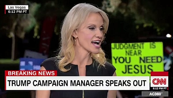 But just because that's true doesn't mean it doesn't hurt Kellyanne Conway's feelings when you point out that she literally sold her soul to Orange Satan for this campaign, and also she will probably go to hell when she dies: