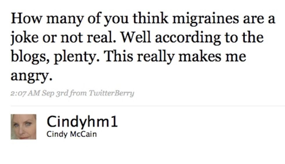Cut it out, Wonkett! Cindy McCain's really really upset. She gave an interview toPeopleabout her barfy headaches and said funny things and all *you* people did was LAUGH at these funny things. Now she is raising an army of devils, to kill everyone.