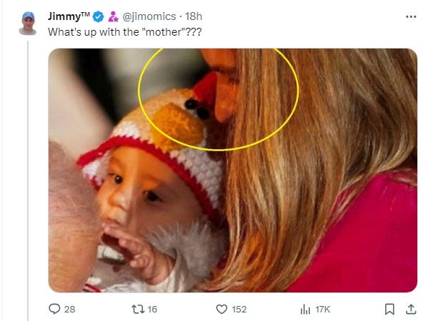 Nah, not gonna bother with the video, which hilariously dubbed in an accordion cover of the Jaws theme that was barely audible, ha ha. The other stories mostly regurgitated the first, but also said the babies were being “assaulted” by Biden and referred to the babies as “victims,” though they and their moms seemed perfectly happy to be there. On Twitter, one weirdo decided one of the moms must be trans, because REAL women don’t have eyebrows and noses, we guess.