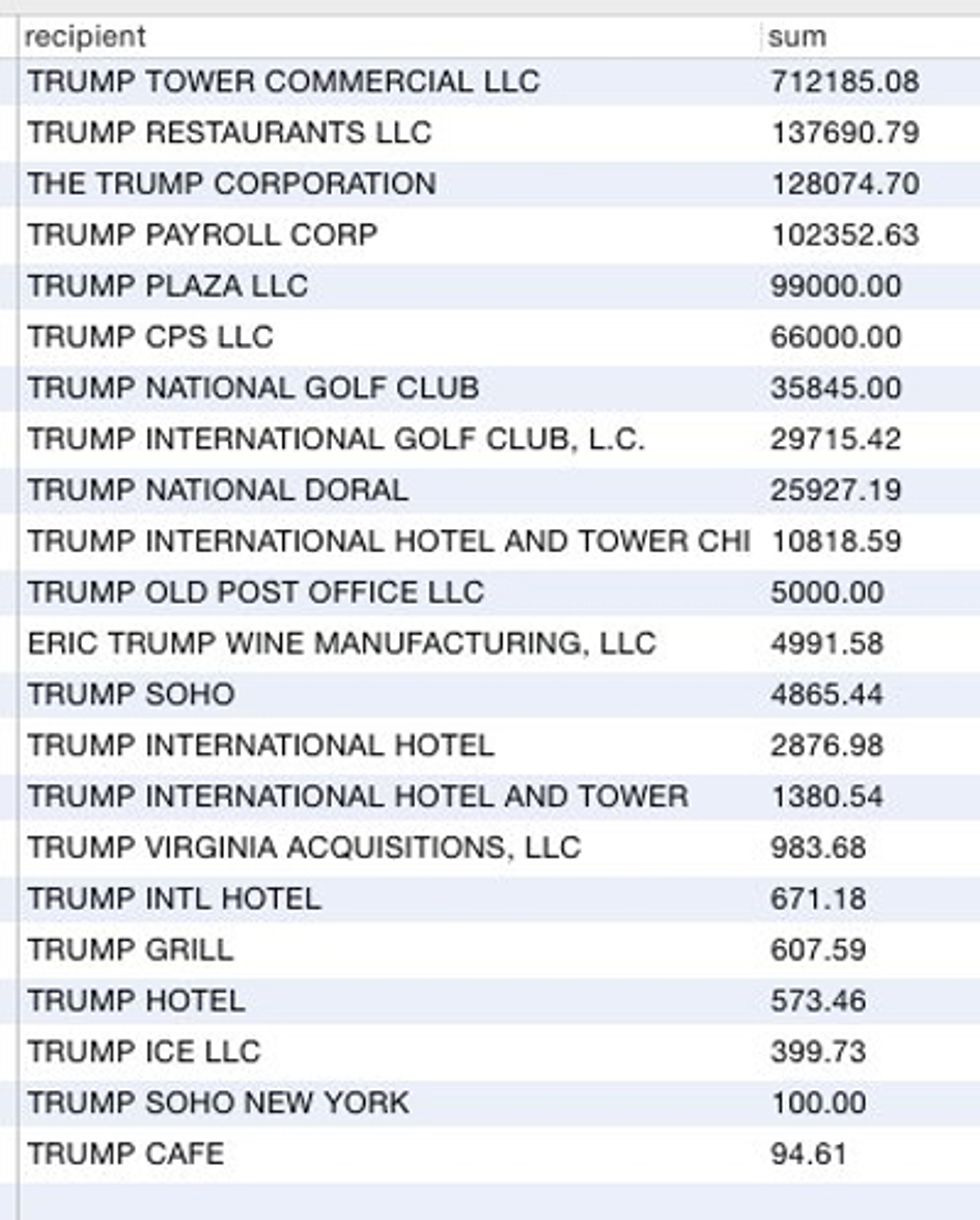 If you don't mind a bit of overlap (and apparently Donald doesn't, haw-haw!), there's also this fun list making its way around the tweeterz, although it only contains payments to businesses with "Trump" actually in the name: