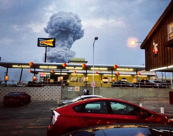Not really part of the news dump, but still got lost amidst all the bombing shenanigans: You probably saw the beginning of this story when it first happened Wednesday night — big mushroom cloud over the Sonic, people explaining that West, Texas, was not actually in west Texas, then there was- OH HEY LOOK BOSTON.