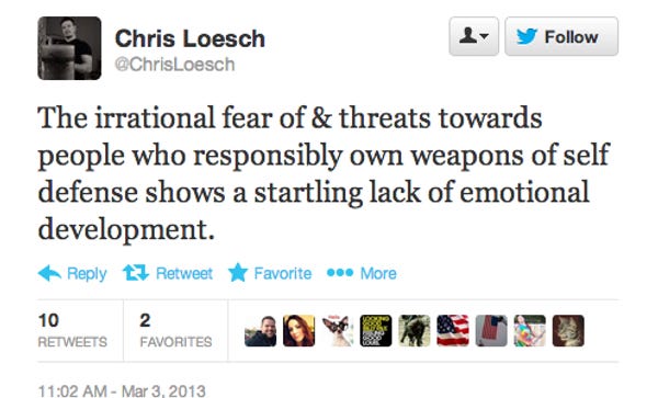 Northwest across the Smokies from North Carolina is St. Louis, home of Chris Loesch, the husband of shrieking conservative hell-beast Dana Loesch, a person who makes us want to puncture our own eardrums with an ice pick. This weekend Chris let one of the bats out of his belfry, where it tweeted this: