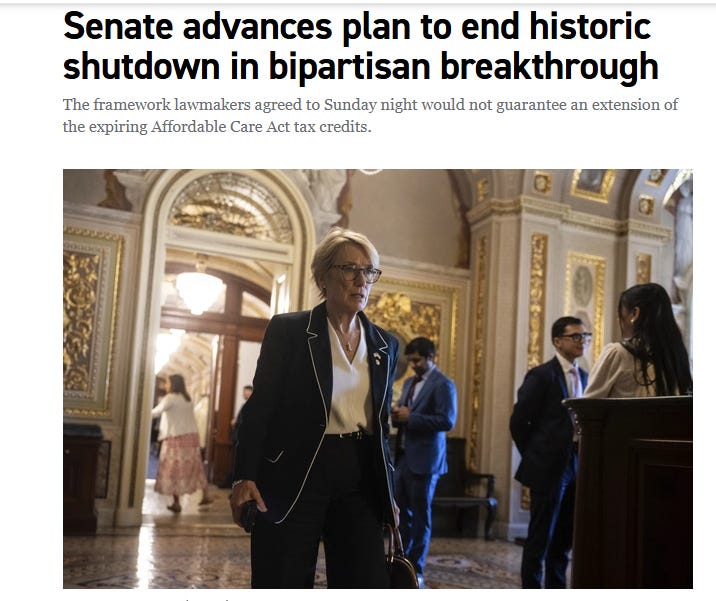 Last night and long after the Sunday shows were done, Chuck Schumer’s eight (pre-approved?) senators helped him pull Senate Democrats from the brink of effectiveness by agreeing to end the longest shutdown in American history for nothing more than a vague promise of a vote on the ACA subsidies by December.