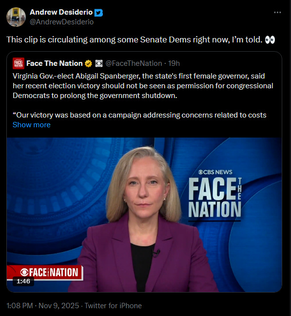 Immediately, reports from people like Andrew Desiderio of Punchbowl.news were leaking out that Senate Democrats were playing this clip to hype themselves to capitulate.
