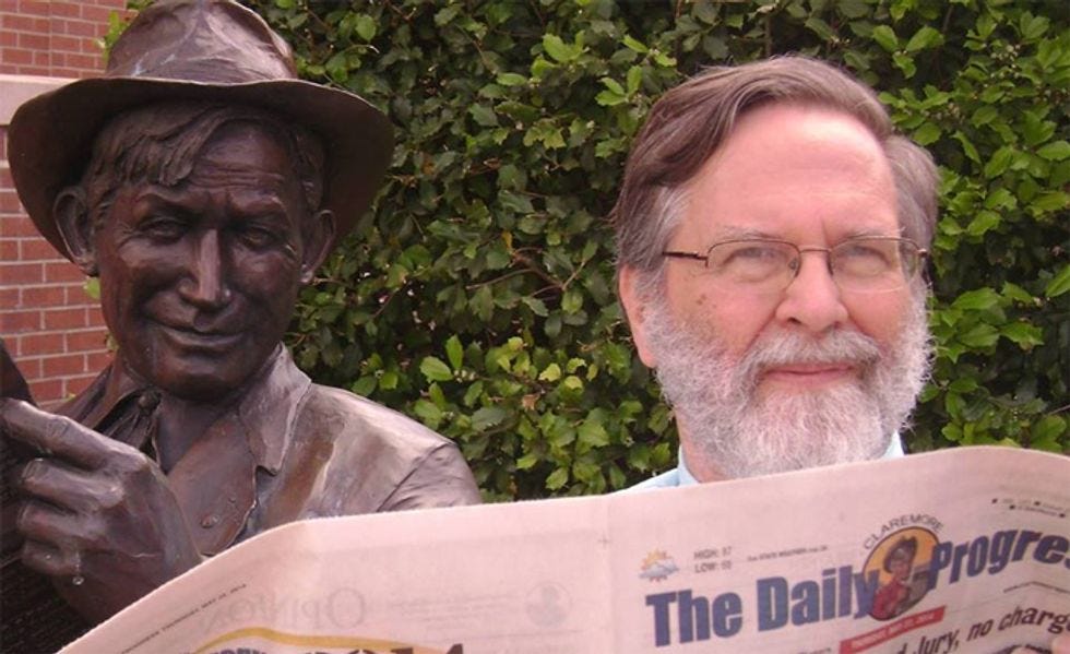 The official Democratic nominee is Mike Workman, who looks remarkably like one of our favorite college professors. We bet he looks like one of your favorite profs, too. He's a retired teacher who's run twice for Oklahoma Labor Commissioner, unsuccessfully -- which is a shame because what would be better than a labor commissioner named "Workman"? You gotta like a guy whose Facebook profile pic shows him with a statue of ur-populist Will Rogers. And you have to be a tad concerned for the prospects of a candidate whose campaign website is his Facebook page. We figured we'd ask our other Oklahoma Wonkette Operative, Commie Mom Donna Schoenkopf, about Workman. She says he's a "sweetheart":