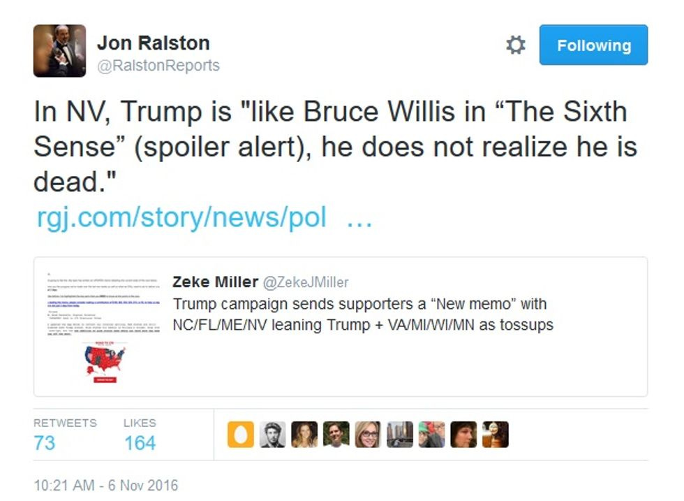 Nevada looks to have one of the closest Senate races in the country; the polling has Rep. Joe Heck slightly ahead of former state Attorney General Catherine Cortez Masto, but a huge early-voting turnout suggesting the state's Hispanic voters would really, really like to make Cortez-Masto the first Latina senator. God Emperor of Nevada politics Jon Ralston declared Donald Trump dead in Nevada's presidential race, based on Democratic early voting turnout: