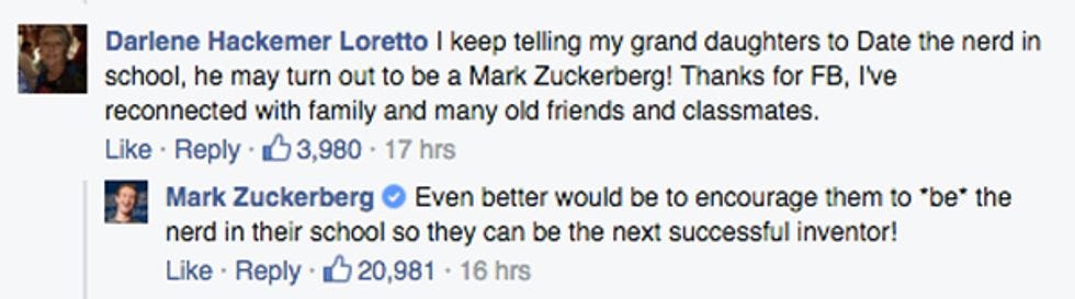 Facebook founder Mark Zuckerberg did a pretty cool thing last week. It didn't even involve what he's best at making: A) Money; or B) inexplicable changes to Facebook privacy settings. In reply to a very chatty post on his own Facebook page where he offered his goals for the new year (build a home AI system for himself and make sure it's not the foundation for Skynet), a woman said that she always encouraged her granddaughters to date nerds, because who knows, that nerd could grow up to be the next Mark Zuckerberg. Zuckerberg gently suggested that maybe grandma might shift her focus a teensy bit: