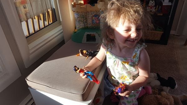 For instance, there is WONDER WOMAN! That's who Wonkette Toddler Human Person Woman is playing with in the picture above! Her name for Wonder Woman is "Woman," which we think is a pretty good nickname. She is also playing with Woman's friends, who are "Batgirl" and "Park Ranger Lady."