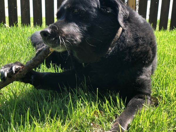 The second thing is that Friday was National Dog Photography Day, which is why Lula gets top billing. That picture was taken after the Mueller hearings, because after Daddy had to steal the ottoman she sleeps on to put his stupid computer on it in front of the TV all day long, it was GODDAMNED STICK TIME.