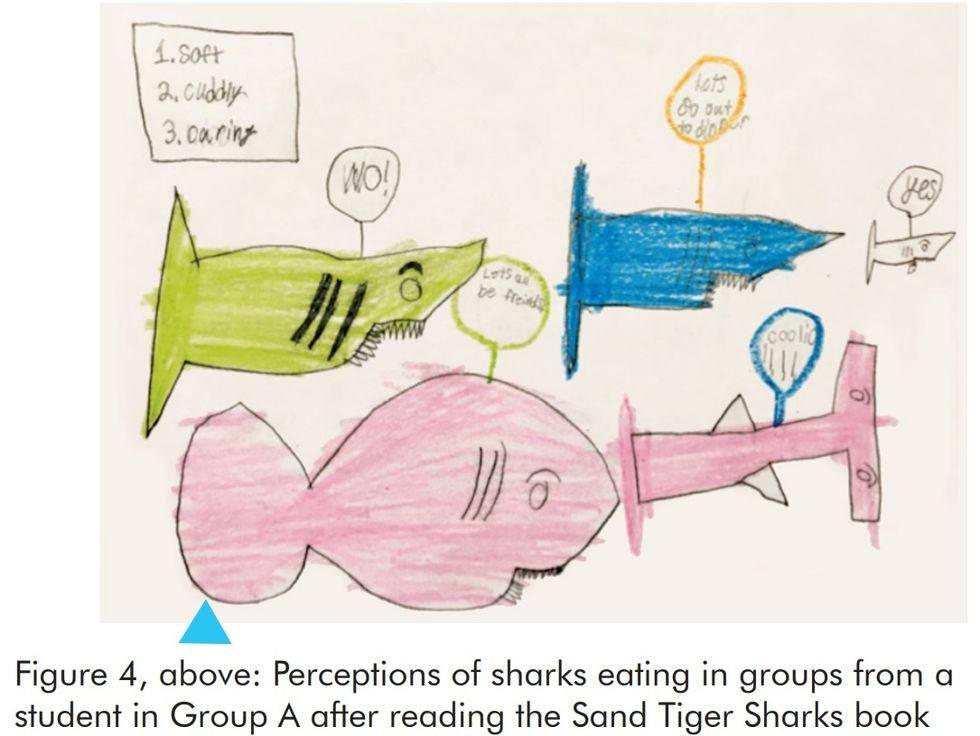 We recently started following marine conservation biologist David Shiffman on Twitter. He's a bigtime shark guy, and last week he found his favorite illustration ever from a scientific paper. Or at least a science education paper, if you want to get picky. The study, in the International Zoo Educators Association Journal, looked at how fourth-graders' perceptions of sharks changed after reading two versions of a grade-appropriate book about sharks. One version included text and questions that encouraged kids to make connections with the animals, such as noting that a shark uses its teeth like a fork, like you use a fork when you eat. The other just presented the facts without the connection-y text. Big surprise: In pre- and post-reading surveys, kids thought more positively and less stereotypically about sharks when they read the version that drew connections between sharks and the small mammals reading about them. And then there's the illustration, with kids' drawings and the words they thought about sharks: