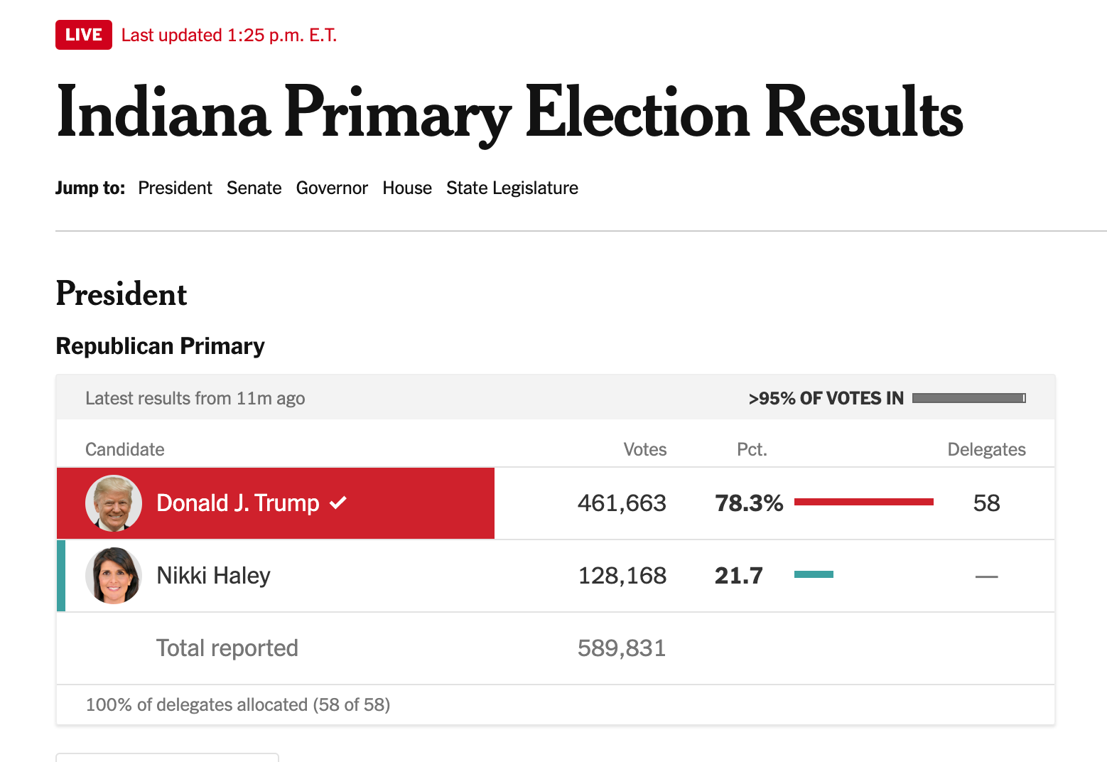 And in Indiana last night, Nikki Haley won 20 percent. Bad news for Joe Biden and RFK’s literal brain worm! (It can’t be bad news for Trump because nothing is ever.)