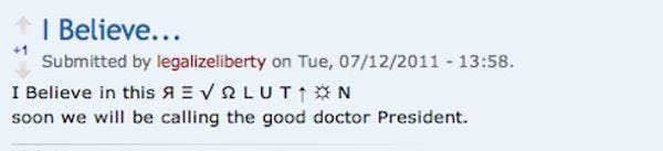 All of this is happening over at the Daily Paul, where the news has hit like a tornado in a trailer park. Is there a secret plan to use the secret code written in the Constitution by the Founders that can give Ron Paul instructions on how to win a national election with 1-3 states? Or was Ron Paul just predestined by the Constitution to come save America from itself, as the Founders wrote? OH LOOK AND HERE IS SOME OF THE CODE: