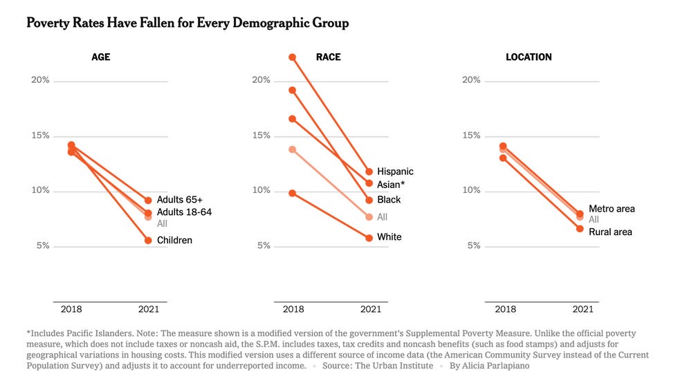 This week, the New York Times published some good news — according to a comprehensive analysis, the money we spent on COVID aid programs cut poverty almost in half, the fastest reduction in all of United States history. The expected poverty rate in 2022 is 7.7 percent, a sharp decline from the estimated 2018 poverty rate of 13.9. This is very, very good news.