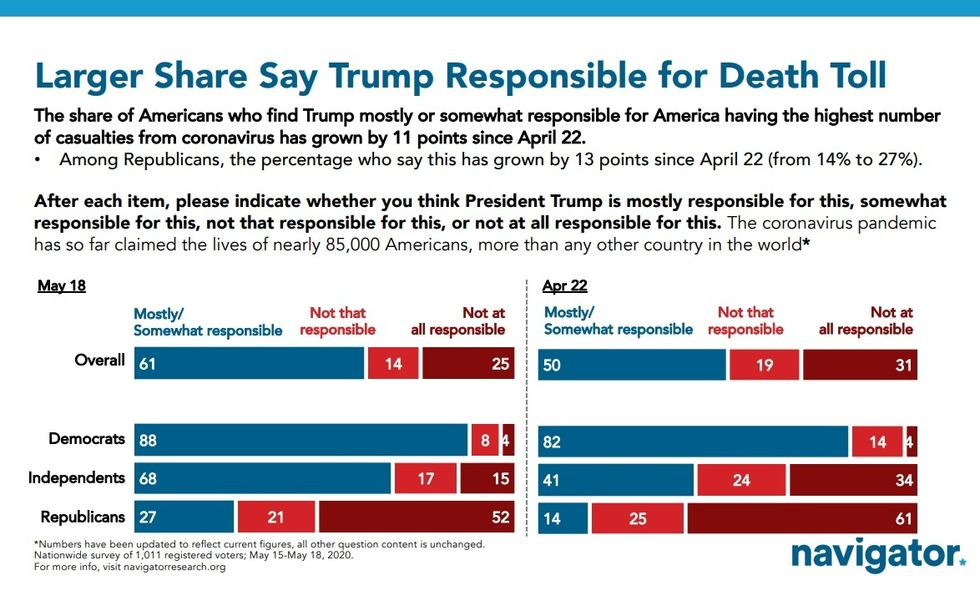 Finally, let's take a look at this Navigator poll, which found that most Americans reject Donald Trump's attempts to blame Barack Obama's administration for America's failure to prepare for that pandemic, and that the percentage of people who believe Donald Trump is responsible for the increasing death toll from COVID-19 has increased significantly from last month.