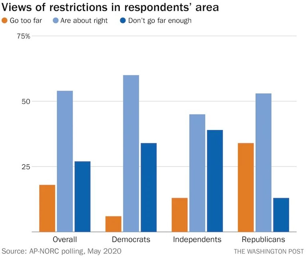 [Most] Americans see the restrictions in their area as being about right for combating the pandemic. In fact, more than three-quarters of Americans think that the restrictions either are appropriate or don't go far enough — and two-thirds of Republicans agree. One-third of Republicans think that existing restrictions go too far, making up the bulk of the fifth of Americans who hold that position.