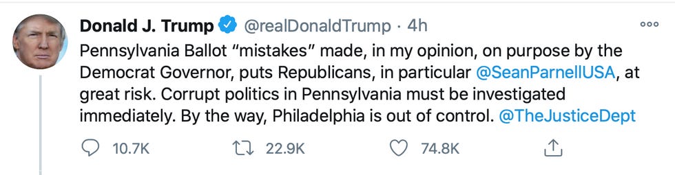 Scranton's own Joe Biden is leading most polls from Pennsylvania, and you know Donald Trump is scared because he's spewing more mindless conspiracy theories and random libel on Twitter. Sunday, Trump repeated his baseless charge that intentional election fraud was occurring in a state he's set to lose in eight days.
