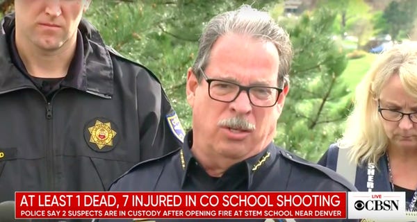 About 1,850 students attend the STEM School Highlands Ranch, which covers K through 12. One of those students lost his life yesterday and eight were injured. The shooters are believed to be students, one an adult male and the other a minor. They entered the school and commenced their rampage just before 2 p.m.