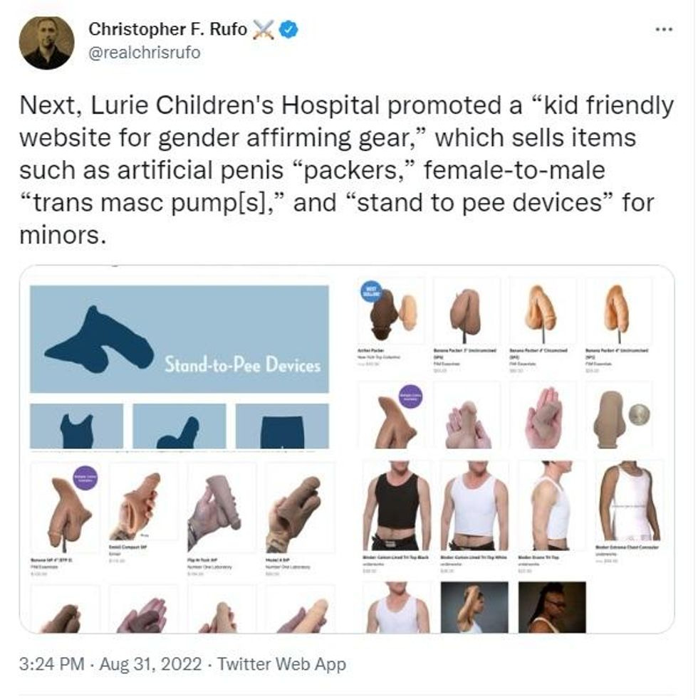 a "kid friendly website for gender affirming gear,” which sells items such as artificial penis “packers,” female-to-male “trans masc pump[s],” and “stand to pee devices” for minors.