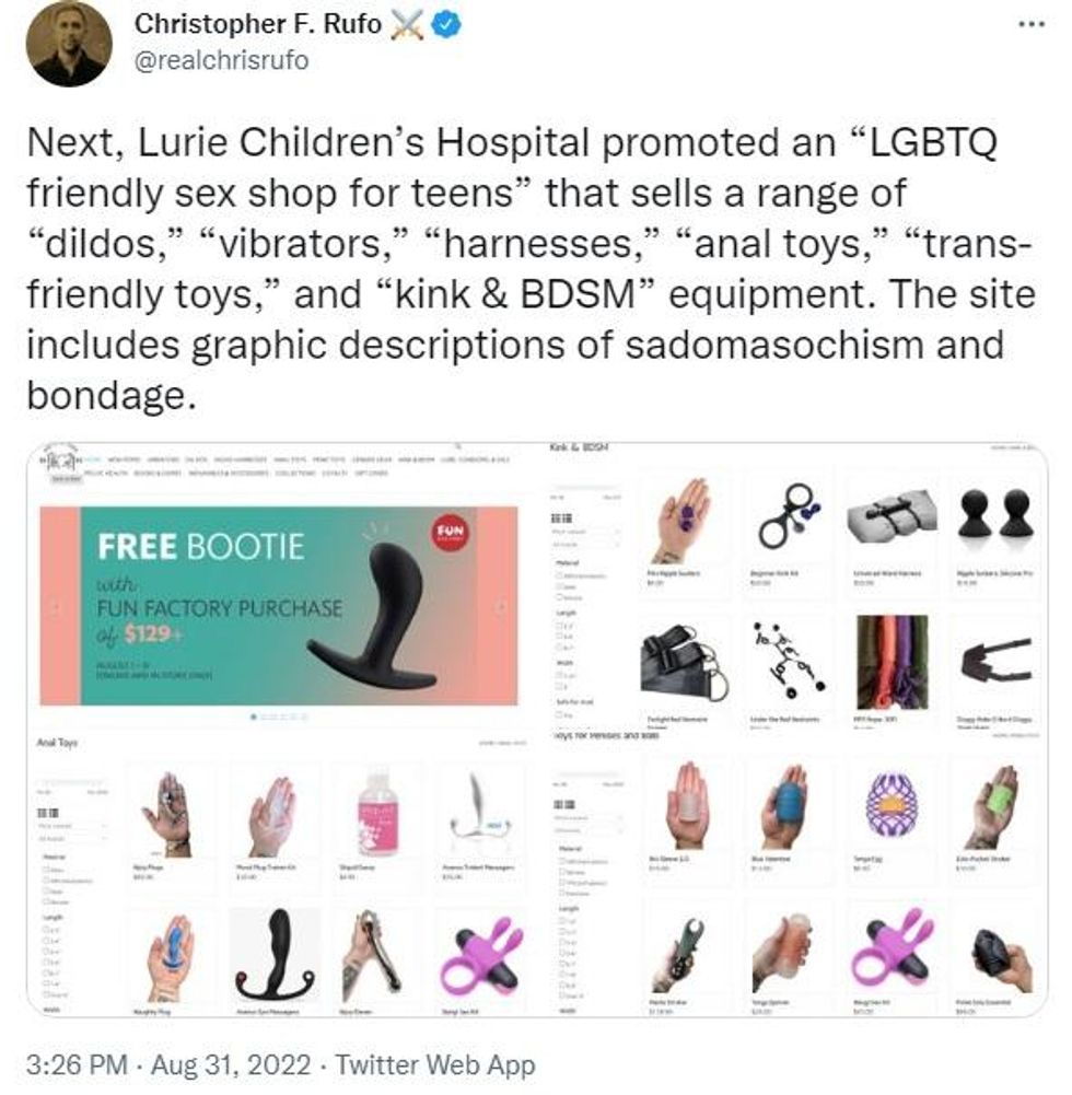 This is, of course, pure bullshit. Here's the part that's true: Lurie Children's does indeed provide services for transgender and gender-nonconforming young people, up to the age of 25. And the hospital also provides outreach programs for Chicago-area school faculty and administrators about how to provide a gender-inclusive, supportive environment for LGBTQ kids. So when Rufo freaks out about "radical gender theory," that's what he's talking about. As we'll see, it's pretty bog standard trans panic stuff complaining that the hospital is promoting "trans activism" and undermining all of Western civilization. Ah, but what about the porn and the kink and the BDSM and the SEX TOYS FOR CHILDREN — why on earth would any responsible medical institution "encourage" or "promote" such filthy filth to innocent children in school?
