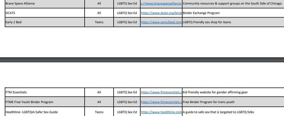 The list of additional resources includes links to a bunch of social service agencies, parent and youth groups, sex ed sites, and magazine articles like Teen Vogue'slist of "20 LGBTQ+ Books for Teens Coming Out in 2020." And the list also includes links to a couple of sites where Rufo found sex toys and blog posts about actually doing sex, which he then proclaimed are being "recommended for kids," although again, the presentations were only for school staff, and there's nothing in the presentation saying "Hey, go visit all these sites with your students!" In fact, beyond existing as part of the slideshow, it's not clear what use, if any, presenters from Lurie made of the resources list during presentations in the schools.