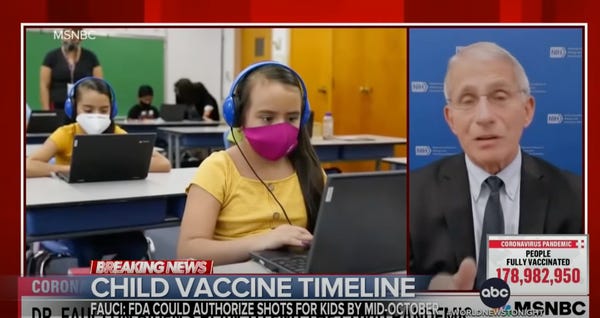 Pfizer will apply to the Food and Drug Administration (FDA) for emergency use among the younger age group by the end of this month. There's probably a lot of paperwork. A few weeks ago, FDA chief Dr. Peter Marks said once his agency receives Pfizer's study results, it would evaluate the data "hopefully in a matter of weeks" to determine if the shots are safe and effective for younger children. That sounds disturbingly vague. I've worked in operations and “hopefully in a matter of weeks" is usually what you tell a client when you know their complicated request will take forever and what you're actually hoping is that they'll forget all about it after a few weeks.