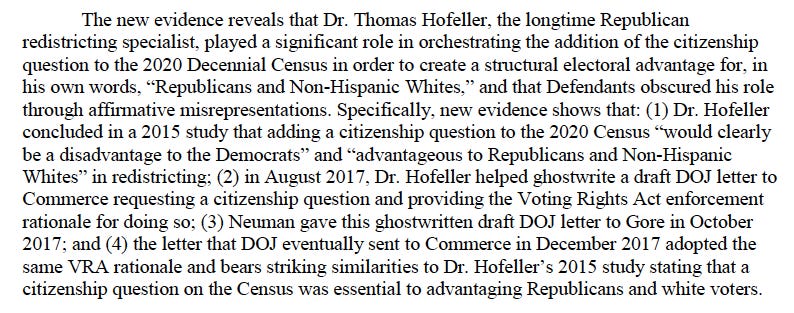 Court documents filed last Thursday showed definitively what most of us already knew: This plot was concocted to help rig future elections for, to quote the architect of the plan, "Republicans and Non-Hispanic Whites."