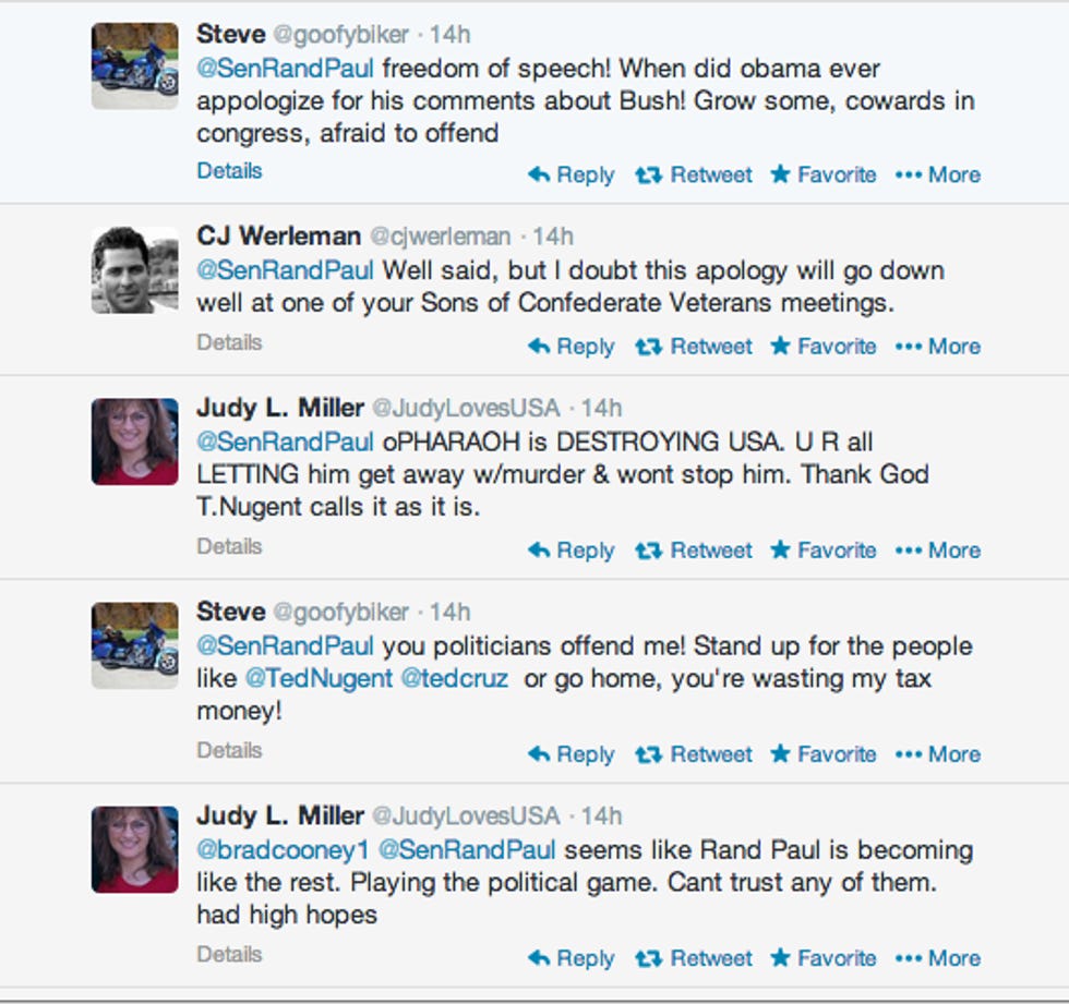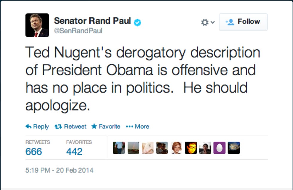 We think we have learned a lesson today, and that is that Rand Paul is a lib RINO squish for saying Ted Nugent should apologize for calling the president of the United States a chimpanzee and also a subhuman mongrel, so Ted Cruz will be the Republican nominee because he made it pretty clear that he is still a racist dick.