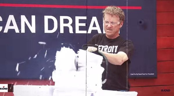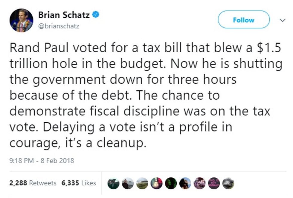 Senator Rand Paul, the hero of pointless grandstanding, managed to grandstand the entire US government into a brief shutdown after the midnight deadline for funding the government came and went without Congress being able to pass a spending package that will fund the government for two years. Paul gave an impassioned speech about Republicans' hypocrisy on debt, which is certainly true enough; they all agree that deficits are terrible when a Democrat is president, and don't matter under Republicans because their party is all about fiscal responsibility, you see: