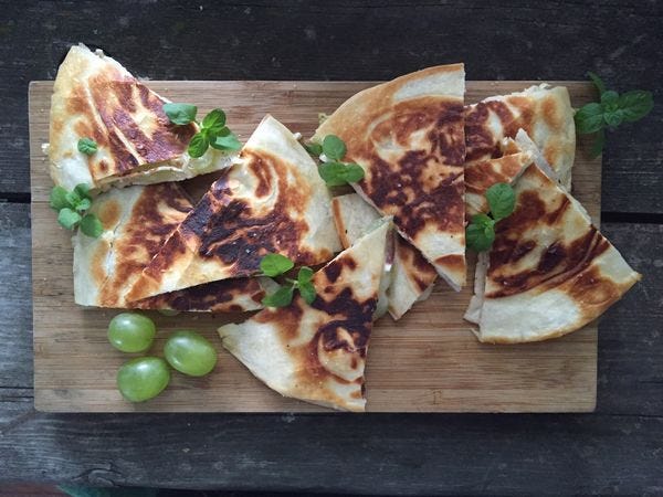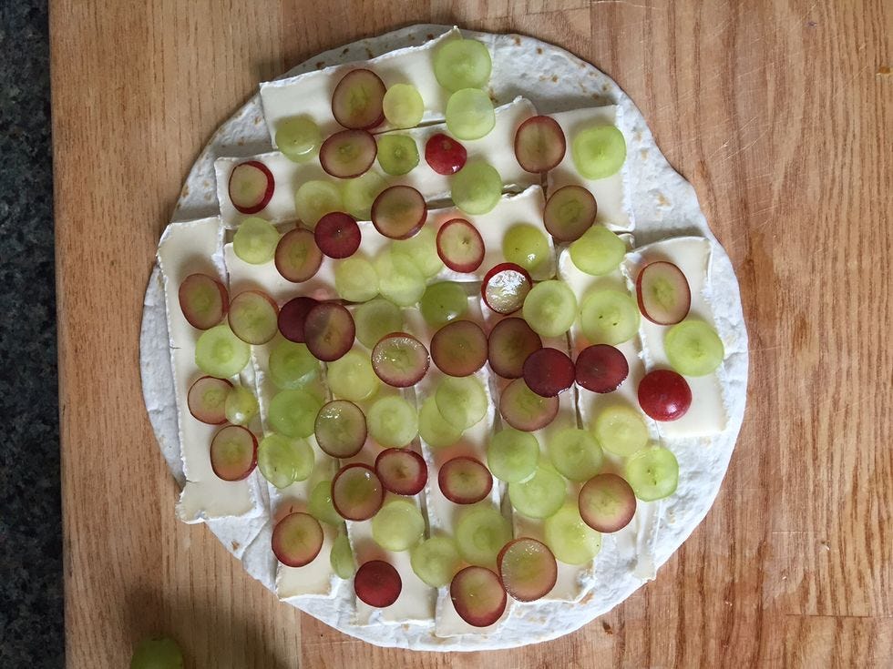 Step I hope this tastes ok. Put that tortilla down, with all its brie and grape goodness. Add a 2nd tortilla on top immediately.