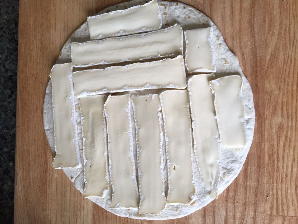 Step two. Slice brie really thin, and lay it over said tortilla.