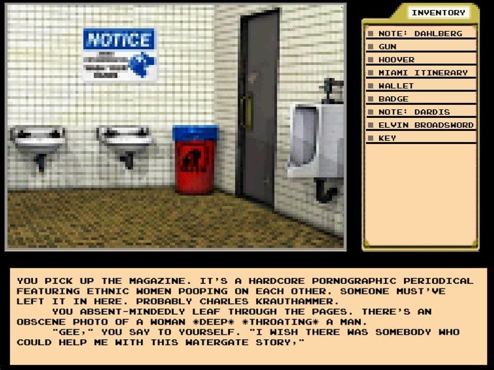 The design of the game is ambitiously primitive, your basic point-and click stuff where you have to go from one static location to another; not a lot of "pew-pew-pew!" here. You are Bob Woodward, a rookie reporter at the Washington Post, and Editor Ben Bradlee calls you into his office with an assignment: find out what's up with this break-in at the Watergate Hotel, and why a Miami prosecutor, Martin Dardis, is investigating the suspiciously large checks recently deposited into one of the burglars' Florida bank account? The plot starts out more or less paralleling All The President's Men, but immediately starts getting weird, like when Ben Bradlee gives you "an Elvin Broadsword" (we assume that's misspelling as trolling). Or the aforementioned Timothy Leary vignette. Or the bit where you have to dig up the skeleton of Nixon's little dog, Checkers.