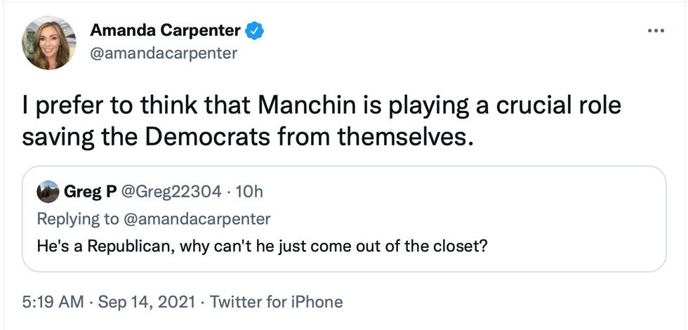When someone on Twitter suggested that Manchin was a closet Republican (I disagree, as only Democrats are chumps about “bipartisanship"), Republican Amanda Carpenter tweeted: “I prefer to think that Manchin is playing a crucial role saving the Democrats from themselves." In reality, Manchin is playing a crucial role saving corporations from the tax rate they endured pre-Trump. (Even former Republican HouseRep. Joe Scarborough called bullshit on corporations crying poverty.) Manchin will also put the brakes on any significant efforts at addressing the climate crisis, even as New York rapidly becomes New Atlantis.